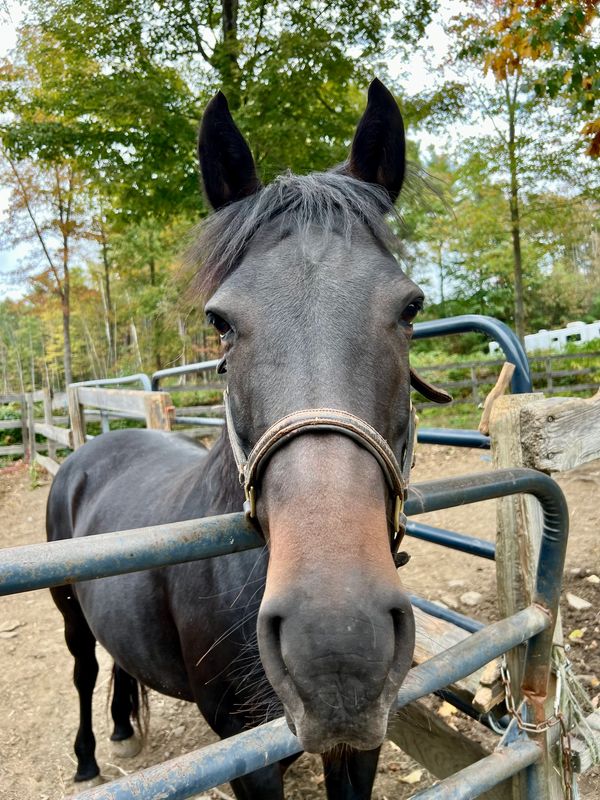 Mariah is our sweet and kind off the track thoroughbred mare who originally arrived at Boulder Brook Stables as a foster case via Hidden Pond Farm Equine Rescue. She arrived very malnourished with a filly by her side. With the help and amazing care they received at BBS they were both able to become healthy and happy again. Her filly was later adopted by an employee at the time and Mariah became a part of the foundation. Mariah is a great example as to why we have a foundation and a safe place for these horses to go. She has been reintroduced to very light work but loves her days being out in the field with Sassy and Friday. She is a very good mare with a very kind heart.
